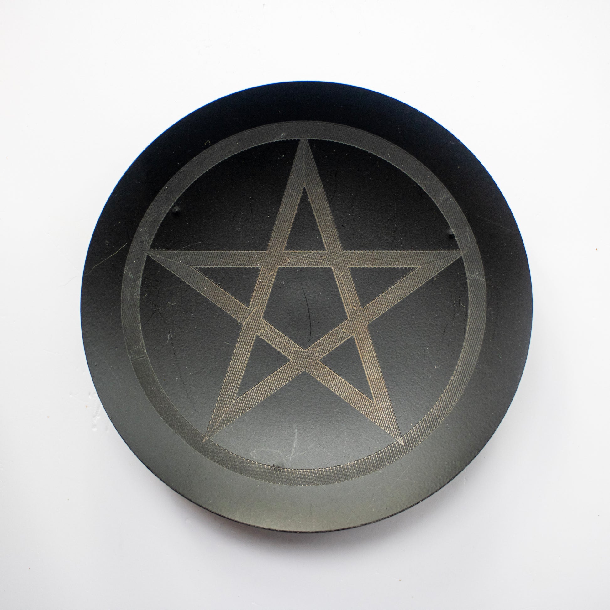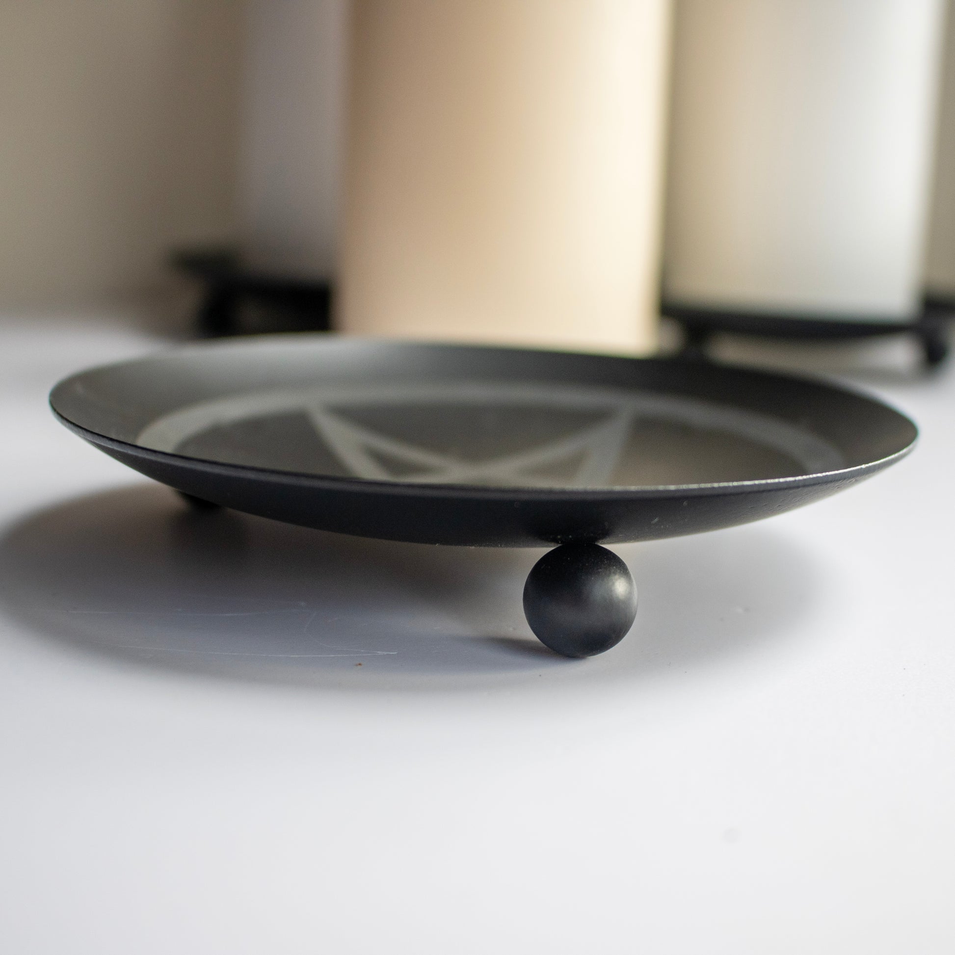 This striking black iron candle holder features an etched pentagram design, the timeless symbol of protection, balance, and elemental energy. With a sturdy, slightly concave dish shape and three small ball feet for stability, it’s perfect for safely holding pillar candles or displaying spell candles during ritual work.