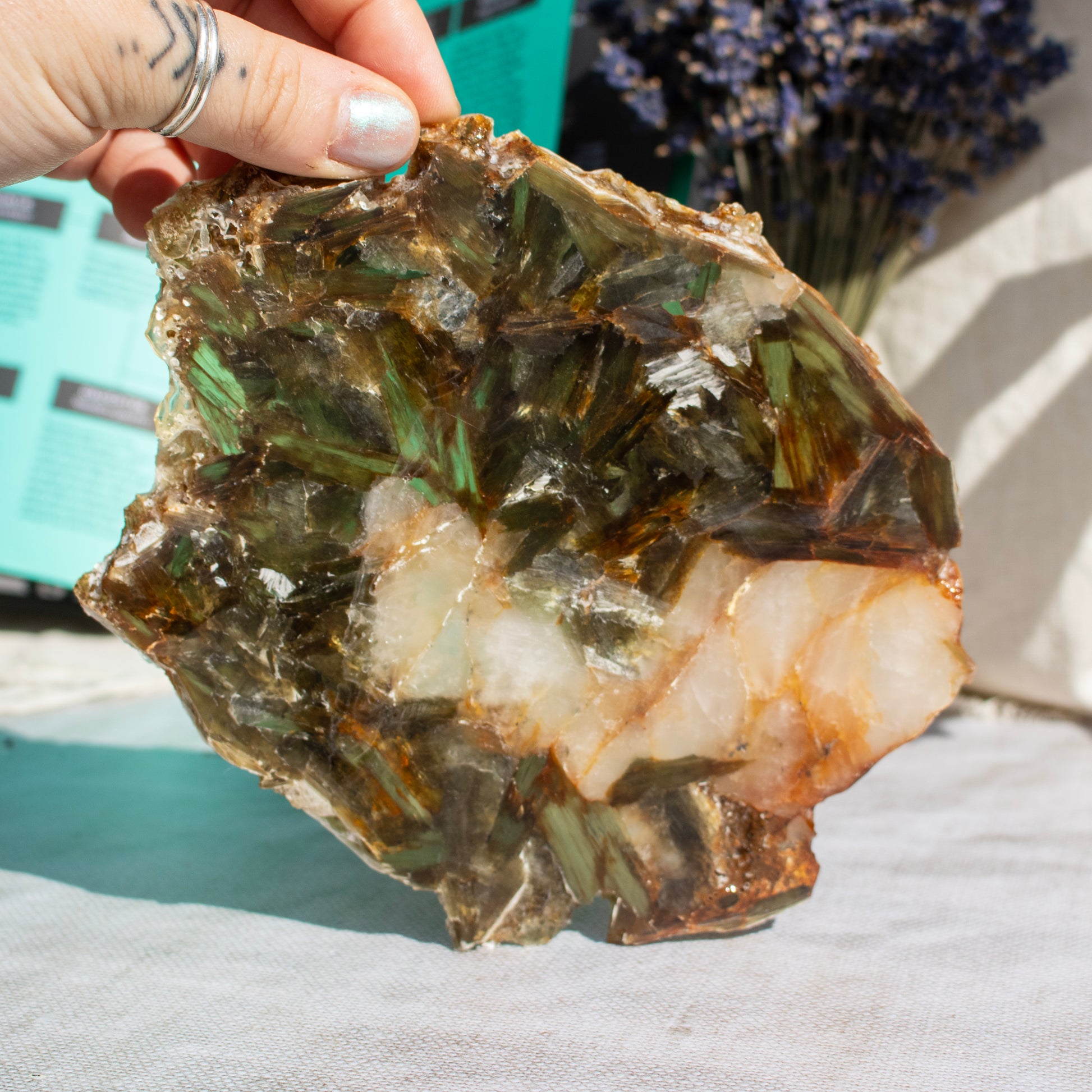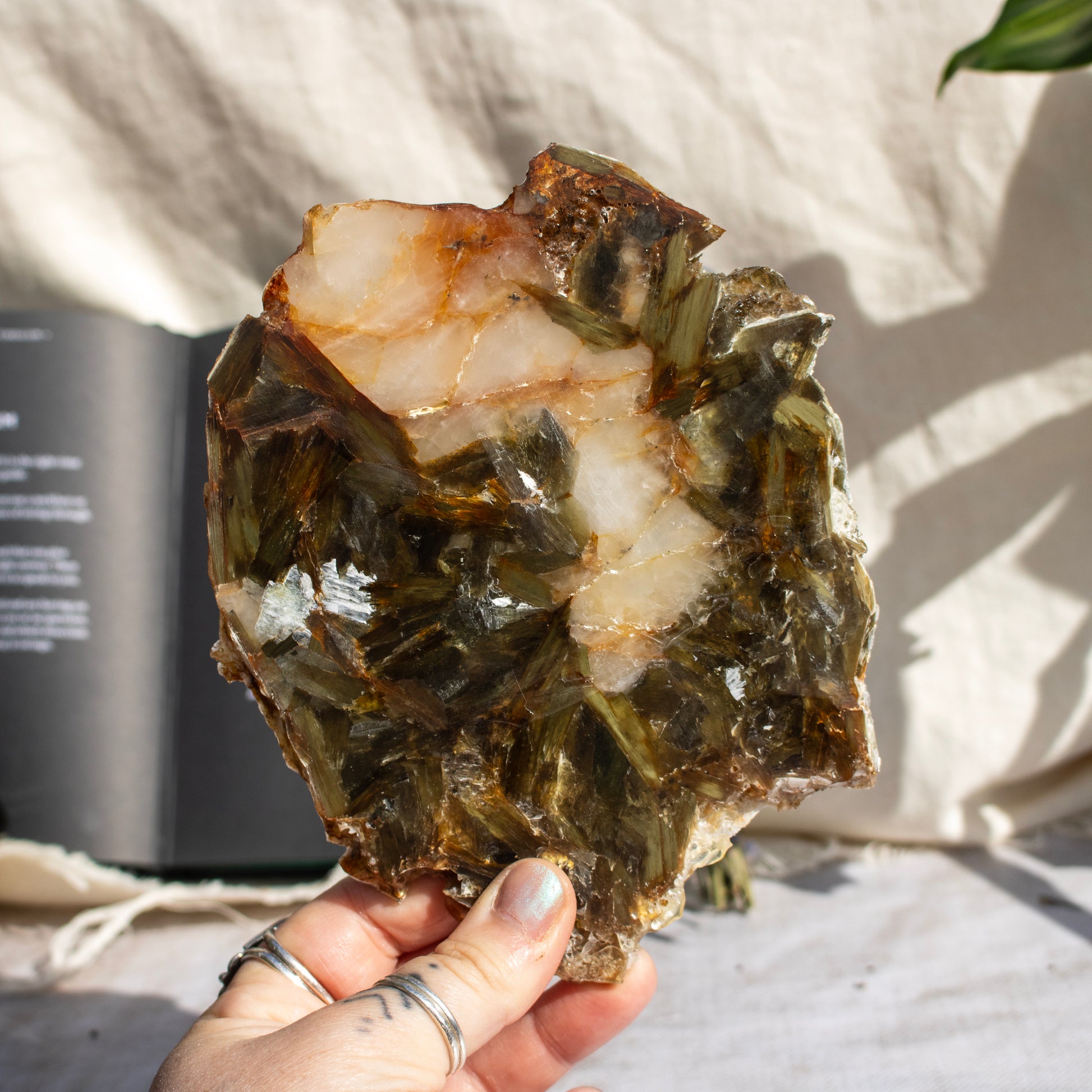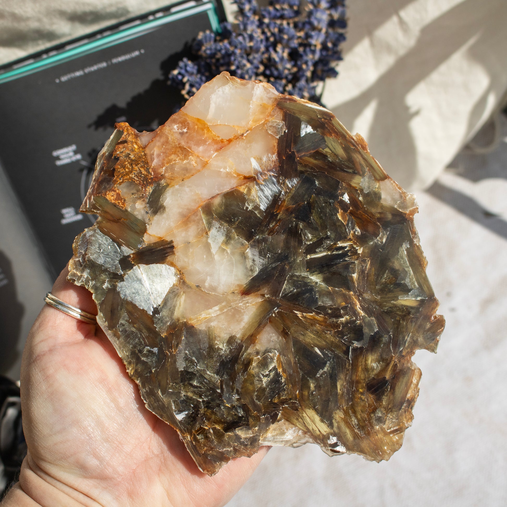 A stunning display piece combining the soft shimmer of golden mica with white quartz.