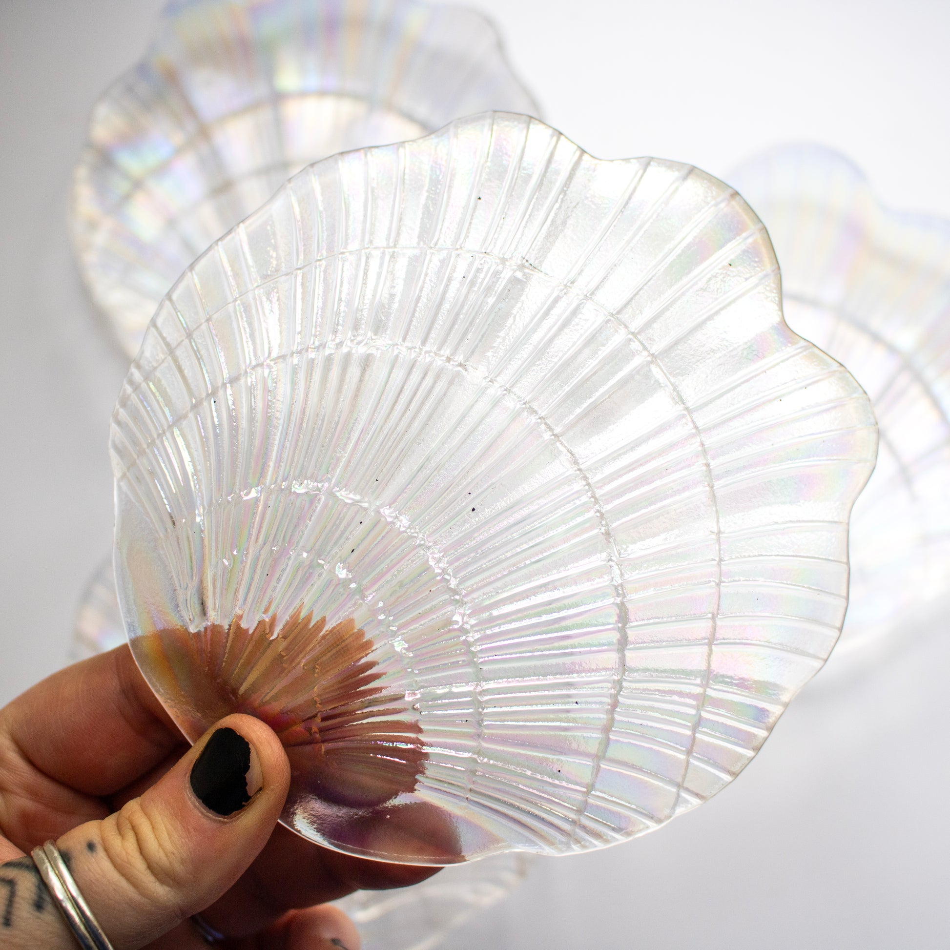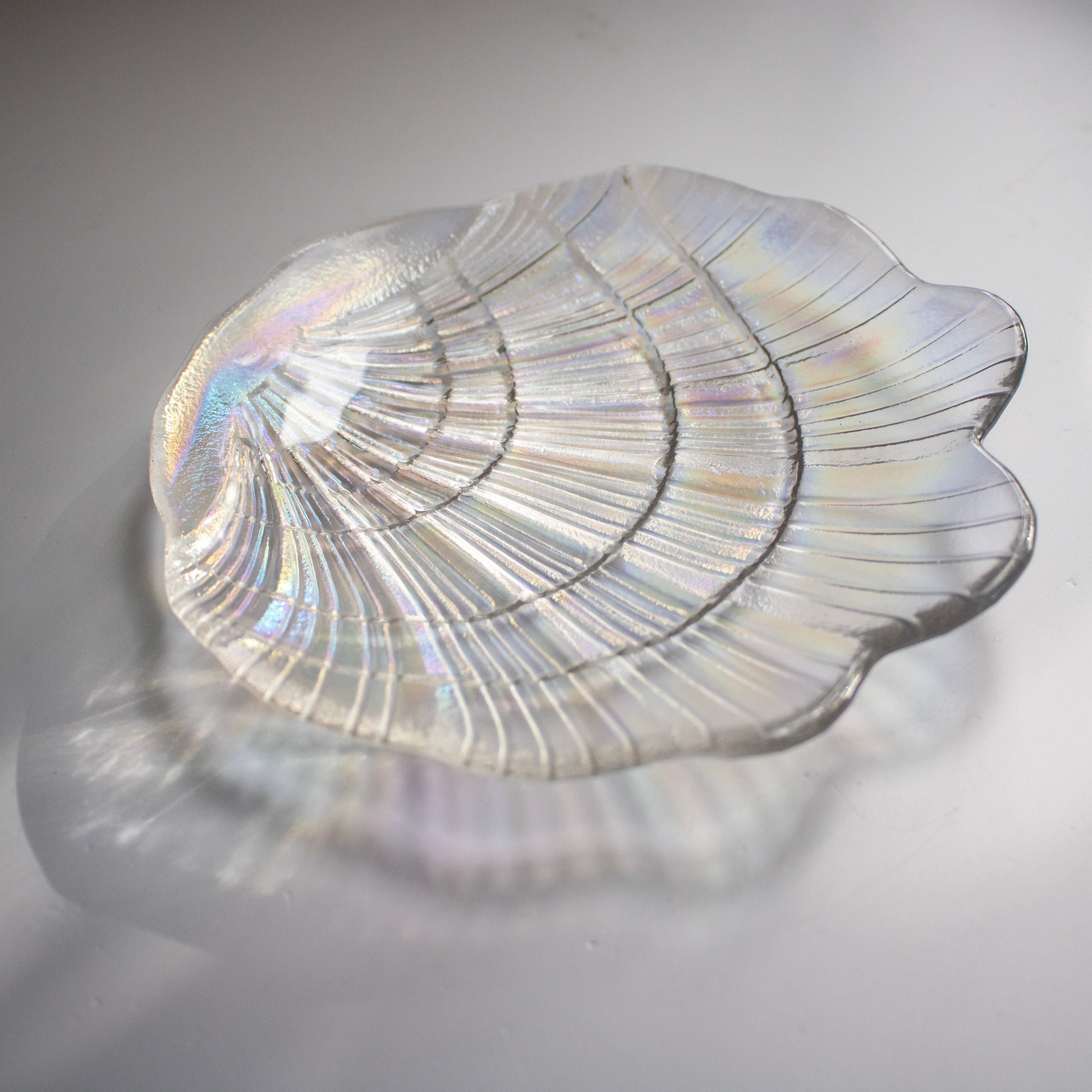 This beautiful iridescent glass dish is shaped like a scallop shell, shimmering with a rainbow sheen that catches the light from every angle.