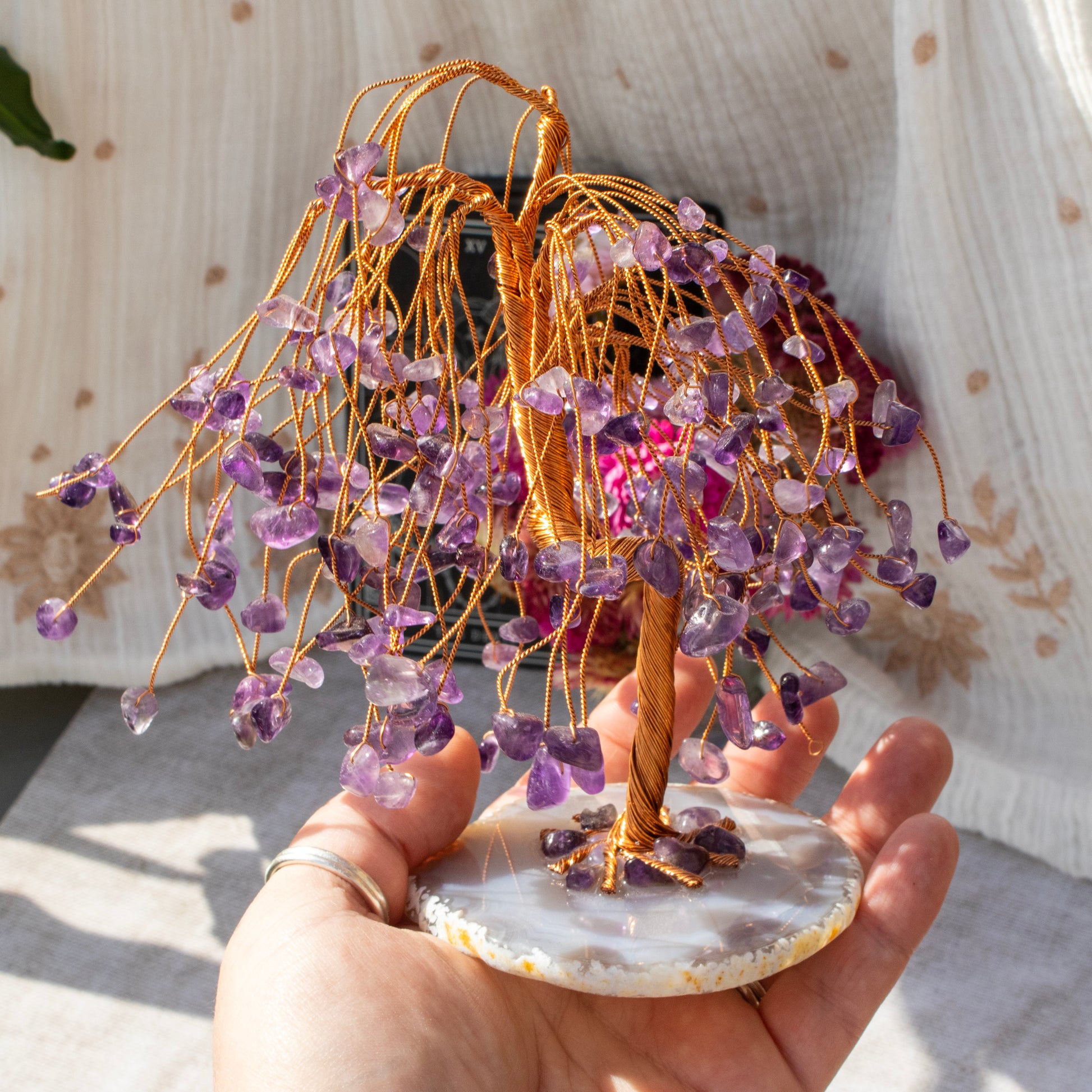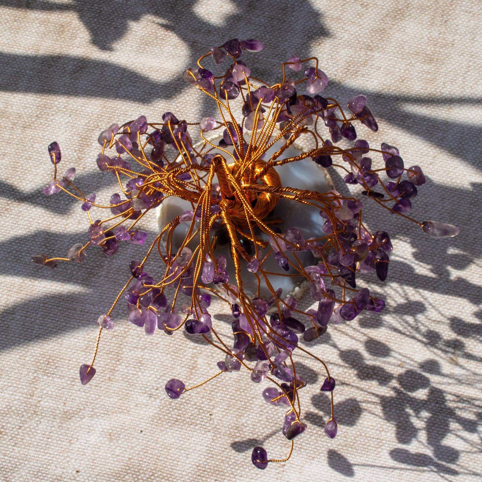 A beautifully handcrafted copper wire crystal chip tree in the form of a weeping willow. This piece is adorned with amethyst crystal chips throughout its flowing branches, set onto a natural agate slice base with additional amethyst chips gathered around the trunk for extra detail. A striking display piece that brings a calming, whimsical energy to any space.