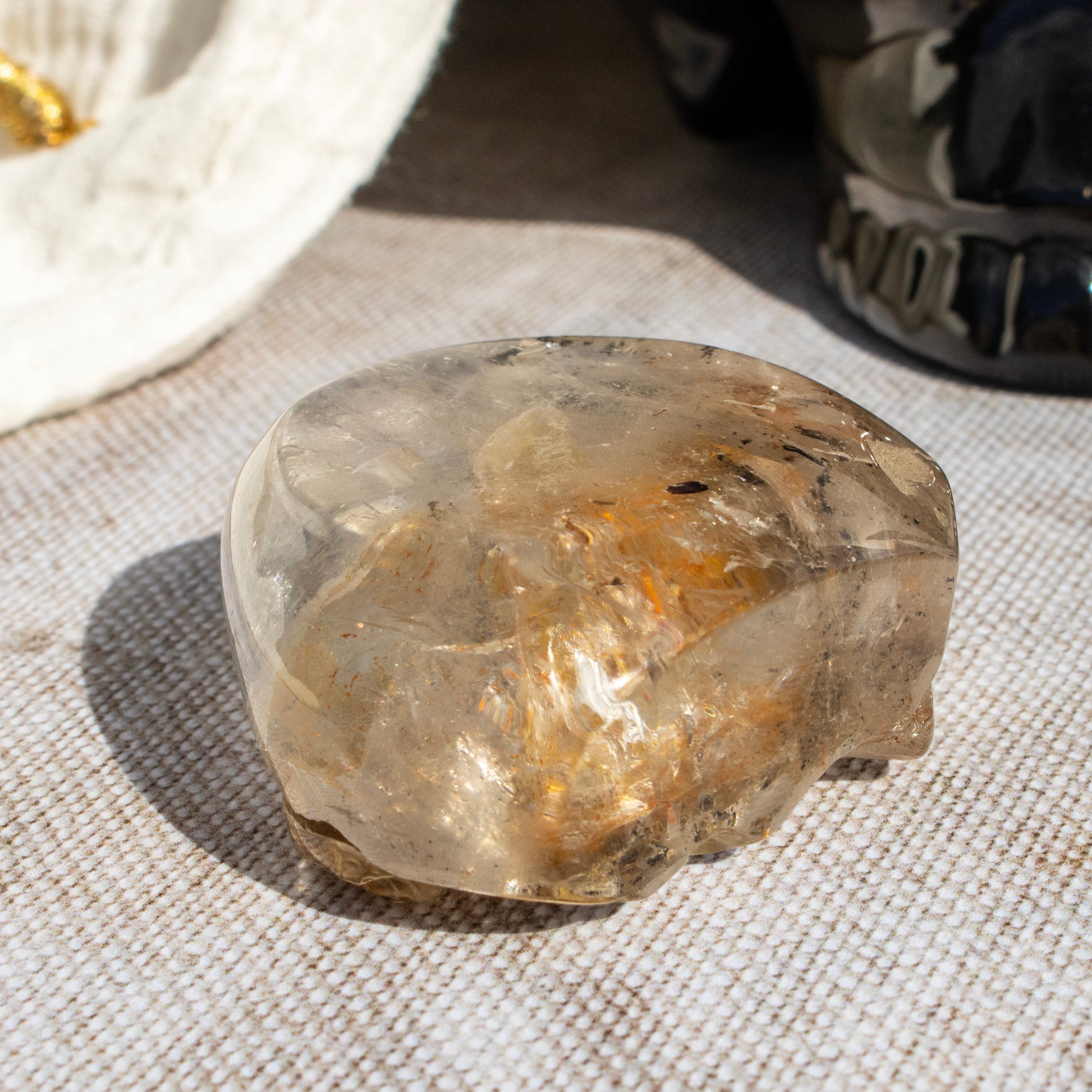 A polished shaman quartz lens with incredible internal detail. This piece has been cut and shaped to showcase the natural inclusions within, giving the effect of looking into a tiny world preserved in quartz. Beautifully clear areas contrast with misty inclusions, creating depth and intrigue when viewed from different angles. A tactile piece with a smooth lens shape, perfect for display or turning in your hand to catch the light.